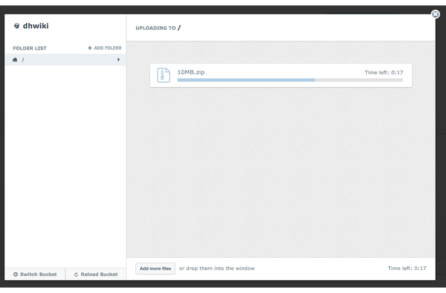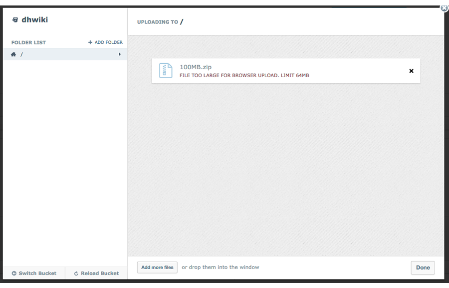 Uploads from your browser are limited in size to 64MB. To upload larger files, you must use an S3 client.