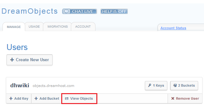 - Locate the User that contains the bucket you wish to work with, and then click the View Objects button.