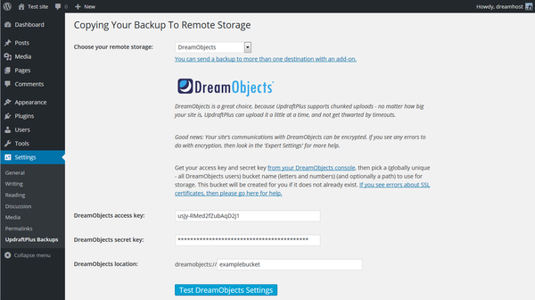 - Click the Test DreamObjects Settings button.