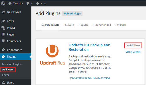 - Search for UpdraftPlus and click the Install Now button.