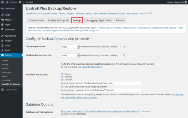 - Configure UpdraftPlus to backup your files and database at the intervals you prefer.