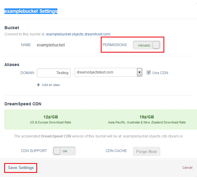 Puedes configurar tu nuevo bucket para que tenga permisos públicos o privados. Revisa el artículo Permisos de DreamObjects para más detalles. Para seleccionar una configuración de permisos, debes editar el bucket: