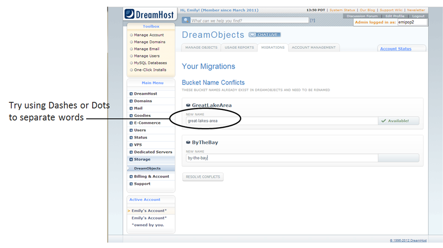 Los nombres de los buckets tienen ciertos requisitos. Revisa el artículo Nombres de buckets de DreamObjects para obtener detalles específicos.