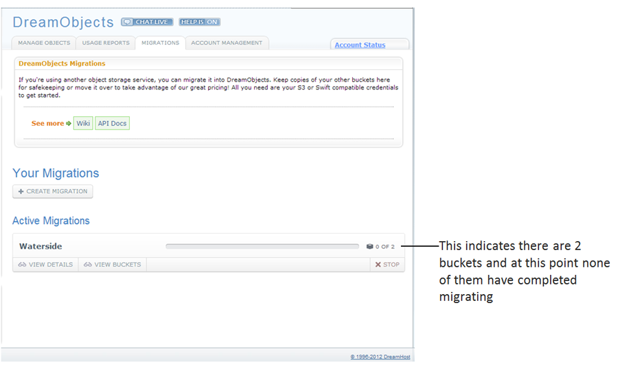Un Bucket es un mecanismo para agrupar objects en DreamObjects, similar a una carpeta. A diferencia de una carpeta, los buckets existen en un espacio de nombres global dentro de DreamObjects, lo que significa que los nombres de bucket deben ser únicos, al igual que un nombre de dominio, ya que se utilizan para crear URL públicas para almacenar objects.