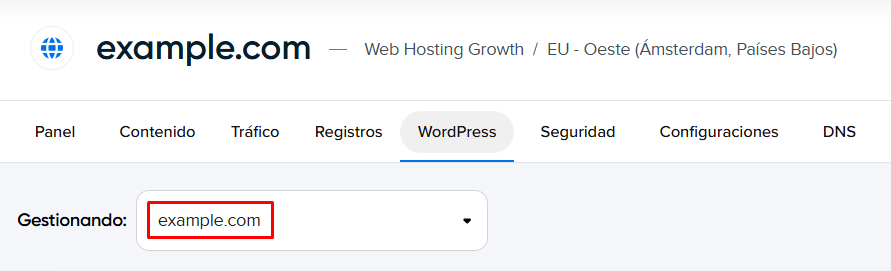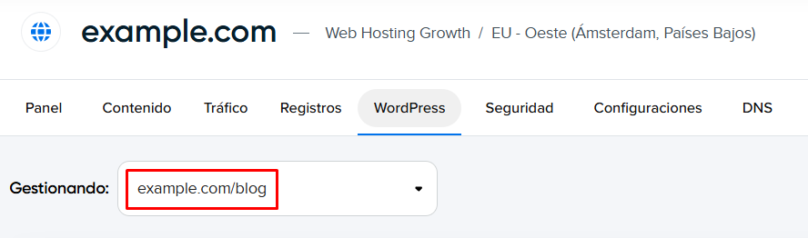 - Selecciona tu instalación de WordPress en el menú desplegable Administrar. Revisa las siguientes secciones para determinar dónde se encuentran tus archivos de WordPress.