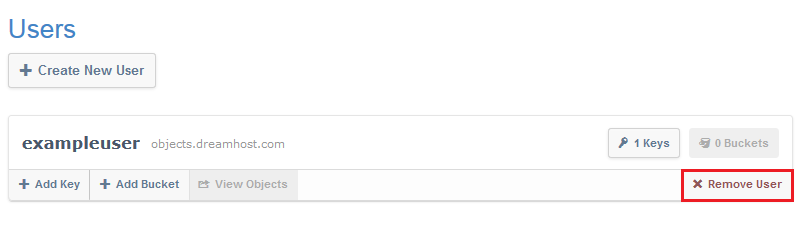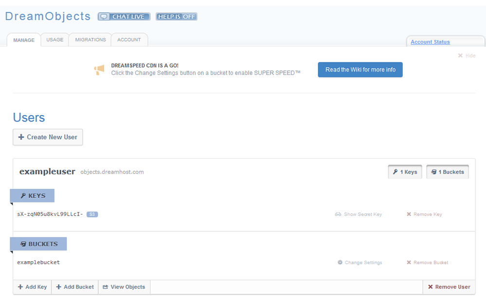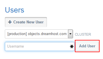 - Haz clic en el botón Crear nuevo usuario en la pestaña Administrar en la página de DreamObjects.