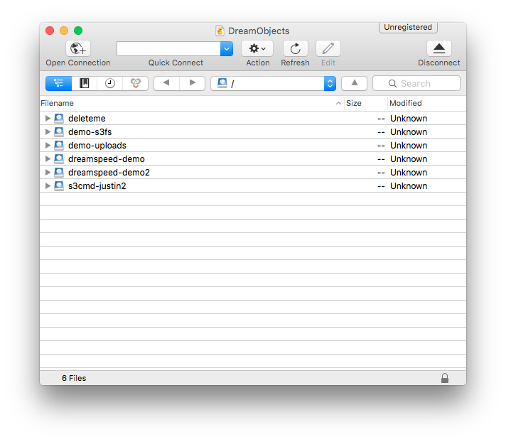 Cyberduck hace que sea muy sencillo administrar tus datos. Una vez que te hayas conectado a DreamObjects, simplemente haz clic y arrastra los archivos y carpetas hacia y desde Cyberduck. En este momento, el tamaño de cada objeto individual está limitado a 10 TB.